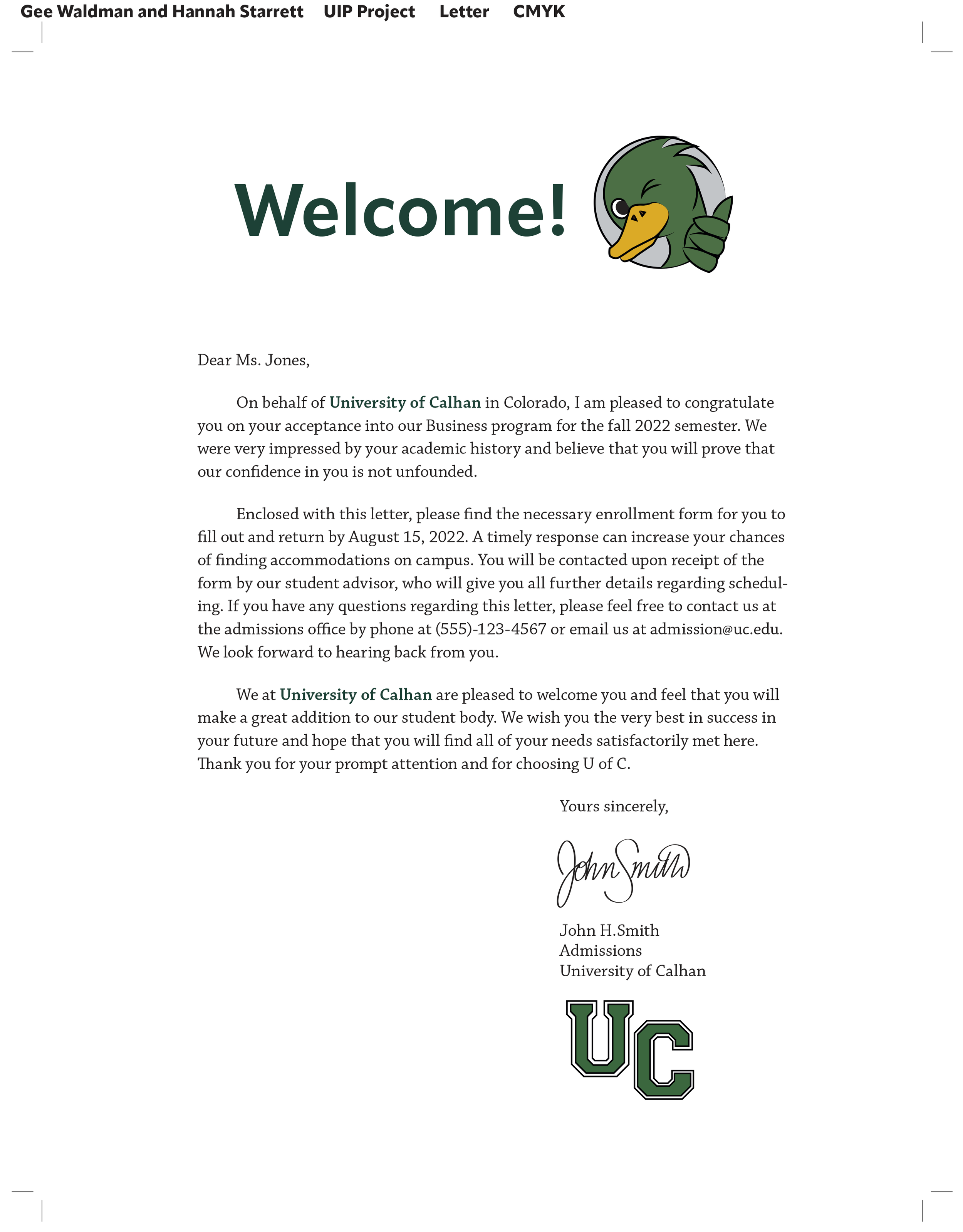 This is a model of an acceptance letter from University of Calhan, complete with the duck emblem, admissions signature, and “UC” letters. This utilizes type pairing of a simple sans-serif font for the header and the typical serif letter copy font of Times New Roman, including all the information you’d hope to find in an acceptance letter!